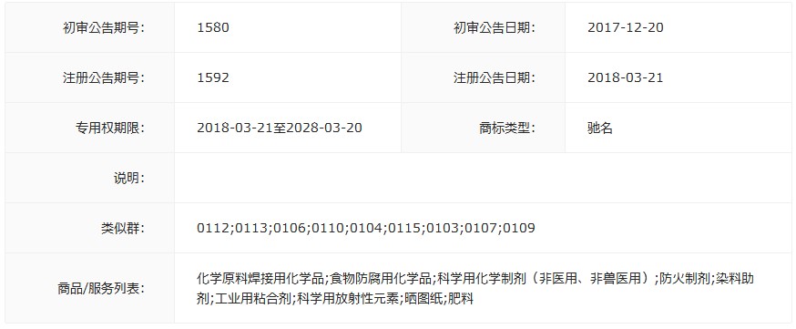 商品服务:化学原料焊接用化学品;食物防腐用化学品;科学用化学制剂(非医用、非兽医用);防火制剂;染料助剂;工业用粘合剂;科学用放射性元素;晒图纸;肥料