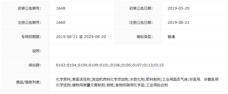 商品服务:化学原料;表面活性剂;发动机燃料化学添加剂;水软化剂;肥料制剂;工业用固态气体;非医用、非兽医用化学试剂;植物用微量元素制剂;相纸;食物防腐用化学品;工业用粘合剂