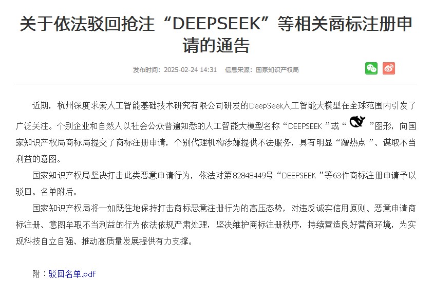 近期,杭州深度求索人工智能基础技术研究有限公司研发的DeepSeek人工智能大模型在全球范围内引发了广泛关注。个别企业和自然人以社会公众普遍知悉的人工智能大模型名称“DEEPSEEK”或“”图形,向国家知识产权局商标局提交了商标注册申请,个别代理机构涉嫌提供不法服务,具有明显“蹭热点”、谋取不当利益的意图。   国家知识产权局坚决打击此类恶意申请行为,依法对第82848449号“DEEPSEEK”等63件商标注册申请予以驳回。名单附后。   国家知识产权局将一如既往地保持打击商标恶意注册行为的高压态势,对违反诚实信用原则、恶意申请商标注册、意图牟取不当利益的行为依法依规严肃处理,坚决维护商标注册秩序,持续营造良好营商环境,为实现科技自立自强、推动高质量发展提供有力支撑。