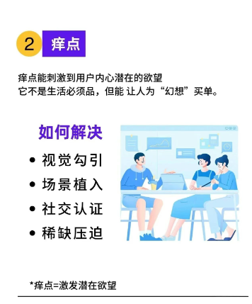 2. 痒点:勾起用户内心潜在欲望,非生活必需品却能让人因“幻想”买单。可通过视觉勾引、场景植入、社交认证、稀缺压迫来激发。