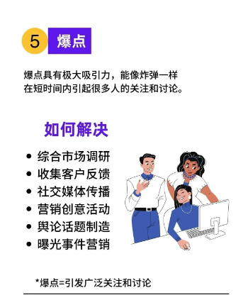 5. 爆点:引发舆论广泛关注,短时间内吸引大量人讨论。可通过综合市场调研、收集客户反馈、社交媒体传播、营销创意活动、舆论话题制造、曝光事件营销来实现。