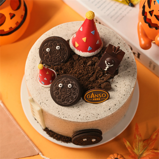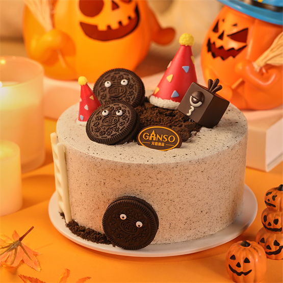 蛋糕本身,完成了一次精彩的“变装秀”。传统的鲜奶蛋糕披上了神秘的“暗黑”外衣,打造出趣味盎然的舞台。奥利奥饼干的酥脆深色,构成了蛋糕的基调,可食用装饰做成了四处张望、俏皮搞怪的小眼睛,派对帽悄然矗立,还有其他古灵精怪的小插件点缀其间,瞬间将节日的搞怪、神秘与欢乐氛围拉满。