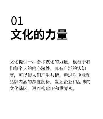 1. 文化力量:文化具备潜移默化的影响力,能引发大众共情。通过深入剖析企业与品牌内涵,挖掘其文化基因,从而构建IP及相应世界观。