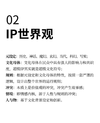 2. IP世界观:包含元设定(如历史、神话等类型)、文化母体(具有强大影响力与共识度,超级IP是超级文化符号)、规则(依据元设定和文化母体,设计世界运行逻辑)、冲突(本质是价值观冲突,可产生故事感)、情境(源于人性与规则冲突的情感内核)、人与物(基于文化背景进行设定与创新)。