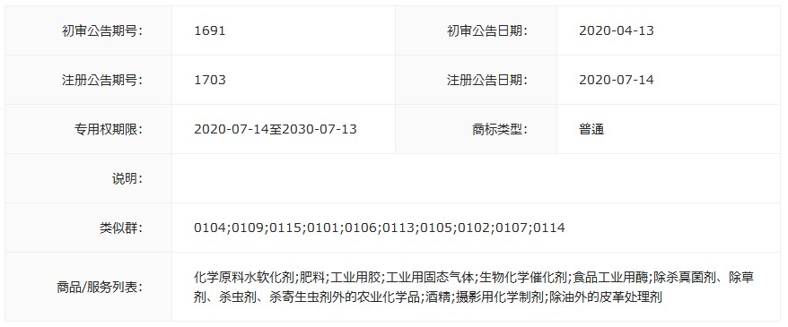 商品服务:化学原料水软化剂;肥料;工业用胶;工业用固态气体;生物化学催化剂;食品工业用酶;除杀真菌剂、除草剂、杀虫剂、杀寄生虫剂外的农业化学品;酒精;摄影用化学制剂;除油外的皮革处理剂